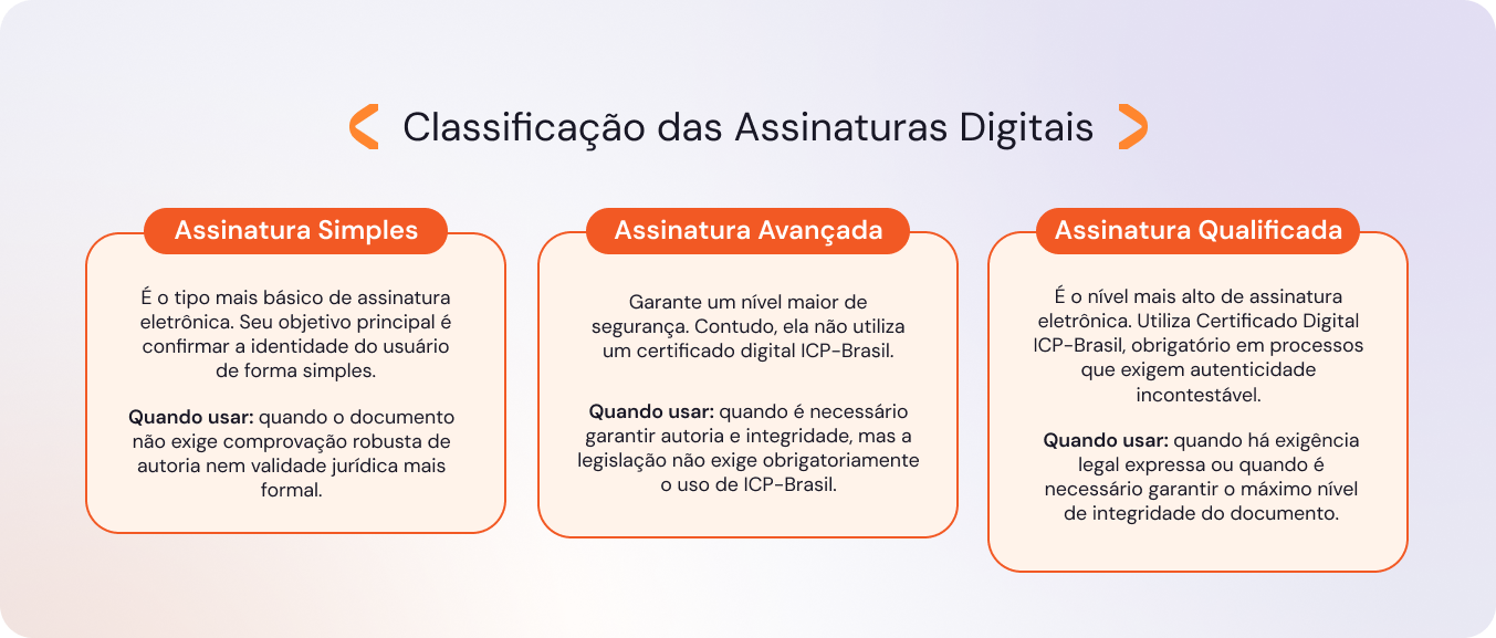 Em 2020, a legislação evoluiu para criar critérios claros de segurança para diferentes tipos de transação. A Lei 14.063 classificou as assinaturas em três níveis, o que é fundamental para o planejamento estratégico de uma imobiliária: