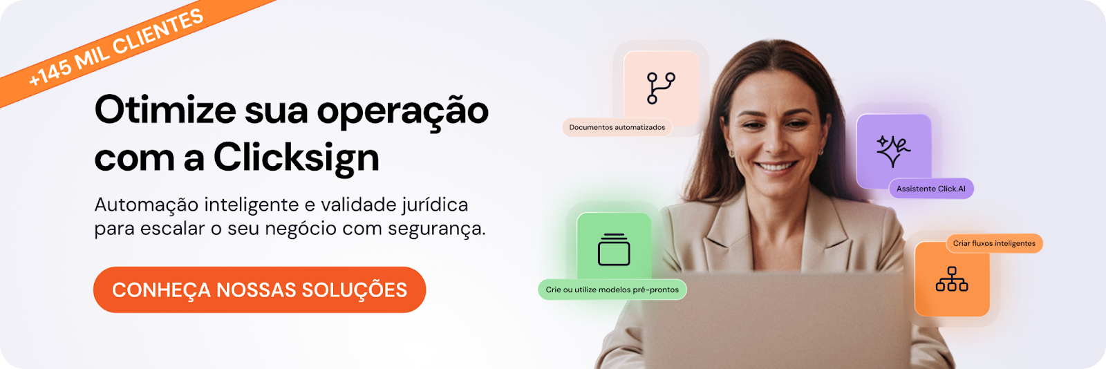 A modernização de uma imobiliária atinge seu ápice quando a assinatura deixa de ser um processo isolado e passa a ser o motor de um fluxo de trabalho automatizado. Na Clicksign, encorajamos a evolução através da eliminação do trabalho manual, conectando inteligência e tecnologia para escalar sua operação sem aumentar seu custo administrativo.
