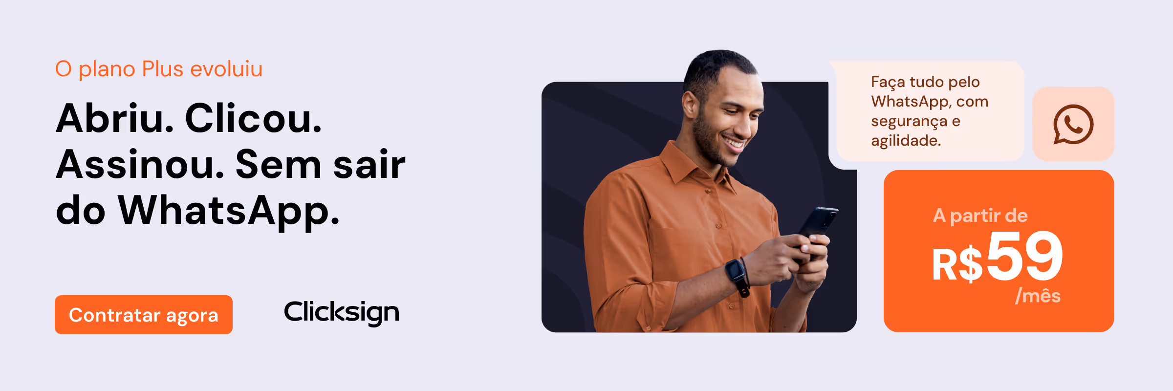 A Assinatura via WhatsApp está disponível no plano Plus da Clicksign, trazendo o melhor da tecnologia para facilitar ainda mais o fechamento de contratos. Com ela, seus documentos chegam direto no celular do cliente, garantindo agilidade, segurança e muito mais conversões — tudo sem burocracias.