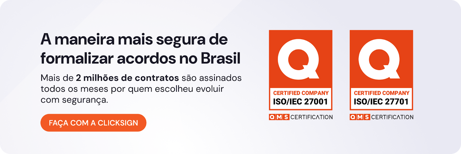 A Clicksign é a única empresa brasileira do setor com certificação ISO 27001. A integração via API herda todos os protocolos de segurança e criptografia da plataforma, garantindo validade jurídica e proteção de dados em conformidade com a LGPD.