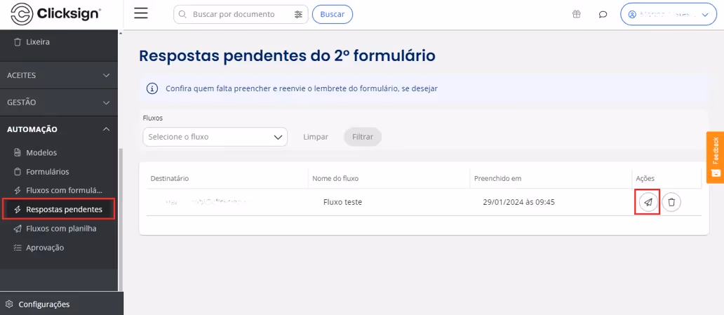 Within the menu “Automation”, under “Pending Responses”, it is possible to follow in real time the second forms that are still waiting to be filled out.