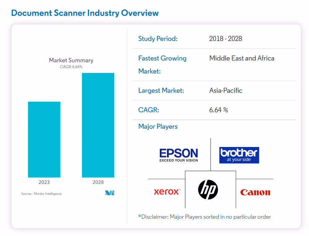 Document scanning services have been growing gradually in recent years and are expected to expand to a CAGR (compound annual growth rate or compound annual growth rate) of 6.64% between 2023 and 2028, according to Mordor Intelligence.