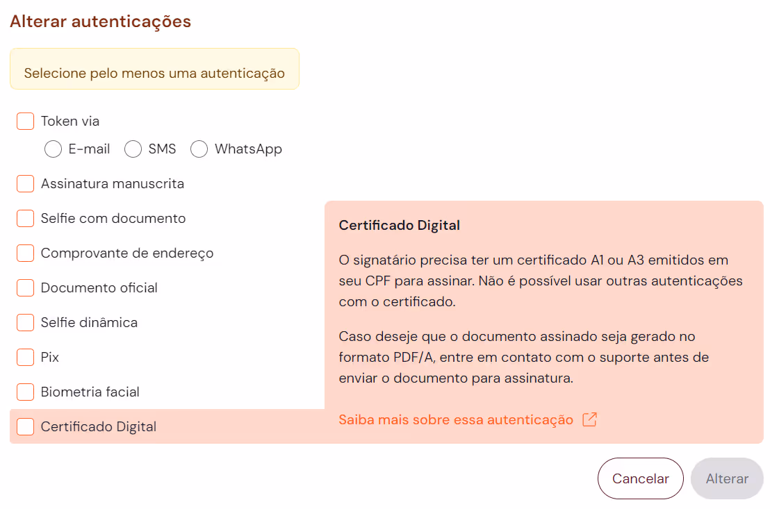 It is worth remembering that, in order for a document to be signed with a digital certificate, this authentication must have been selected by the operator (who sent the document) when configuring the sending of the document for signature:
