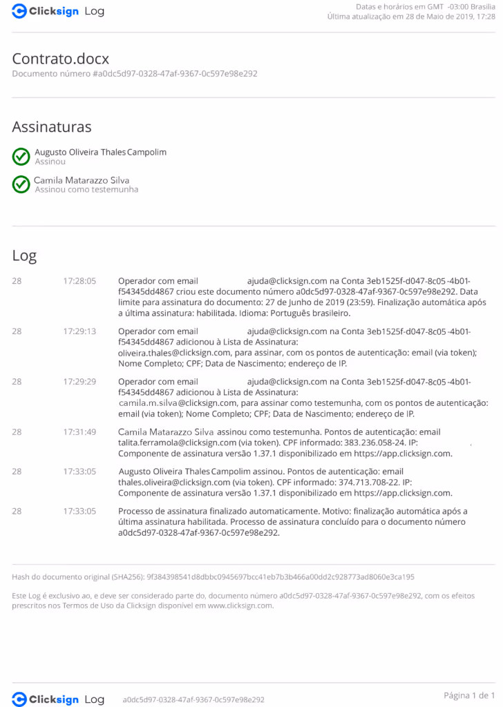 With the signed parts, the file receives two important markings after its finalization: the first is the document number in Clicksign, which is present on every page; and the second is the Hash unique from the original file. Log of signatures works as the link between the document and the signers, with the specific purpose of serving as legally valid evidence. The document finalized with Log is stamped with the Clicksign digital certificate, which indicates, in an auditable way, the origin of the Clicksign platform.