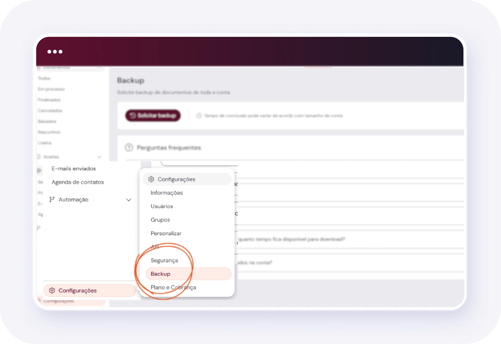 Acesse Configurações > Backup, onde você encontrará o novo botão Solicitar Backup e uma seção de FAQ com todas as orientações necessárias.